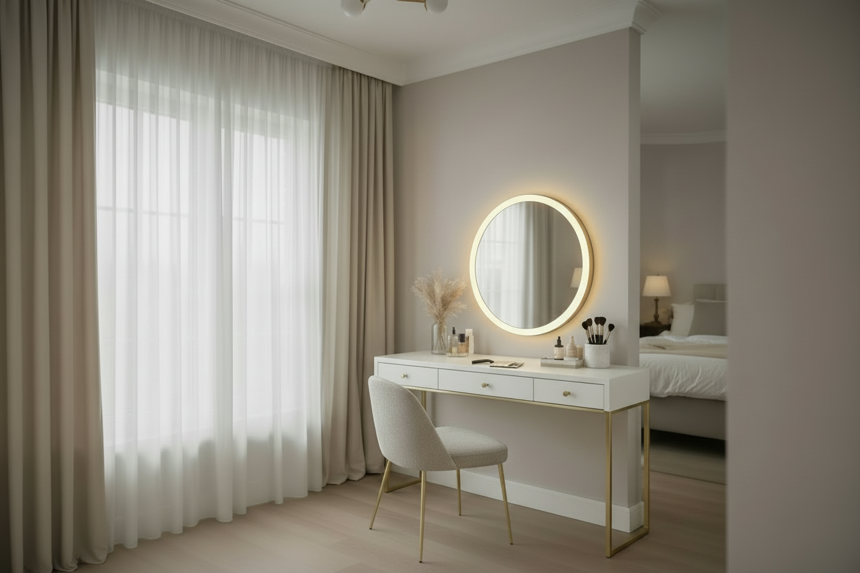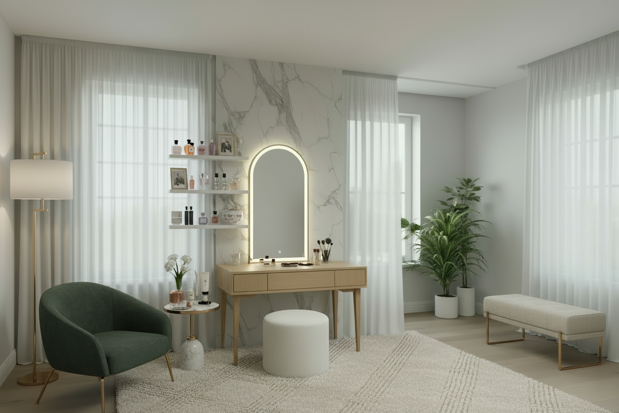 VanityLuxe propose des coiffeuses conçues pour organiser votre espace personnel de manière structurée. Nos modèles aux lignes épurées sont sélectionnés pour leur solidité et leur capacité à s'intégrer naturellement dans votre aménagement intérieur.